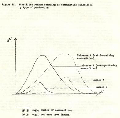 A second consideration in selecting the sampling method is that the more that is known about a population prior to drawing the sample, the fewer cases will be needed to achieve acceptable representativeness. The logic behind this can be seen from the following example. Suppose it is known in advance that some communities in the programme area raise only cattle, some produce only cotton and some only corn, and that ethnic background, cultural patterns and types of local organization are strongly related to type of production. It is important that each type of community be represented in the sample. If the sample is drawn randomly without any further classification (a simple random sample), a rather large number of cases would be needed to ensure that the sample distribution is the same as the universe. If only a few cases were drawn, it is quite possible that none of the extreme cases would be represented or that one or another type of community would be overrepresented, thereby biasing the sample. This could be avoided if a large number of cases are drawn, since, with a large number, it is likely that a few extreme cases would be included and that all types of communities would be represented more or less in proper proportion. On the other hand, if an estimate of the distribution of community types were known and the total set of communities could be classified in advance, as shown in figure IX, it is clear that fewer cases would be needed. By drawing cases according to community type, each type is represented in the sample in proportion to its existence in the population. If, for instance, 20 per cent of the total number of communities in the programme area depend on cattle‑raising, the same proportion of communities in the sample can be drawn from among cattle‑raising communities. In this way, it is possible to ensure in advance that the distribution of cases in the sample will approximate the distribution of cases in the population, according to the production variable.