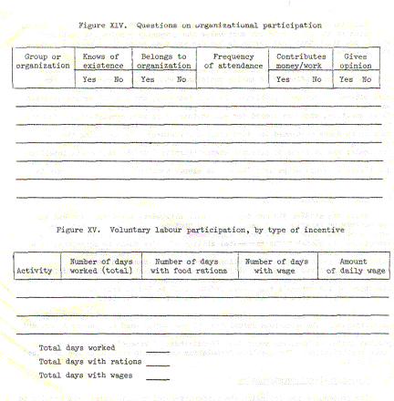 Organizational participation by individuals was considered to consist of three aspects: number of organizations in which there was participation, frequency of participation and nature of participation. The way in which an individual participated could range from mere passive attendance, through contributing money or labour to activities, to active self‑expression on decisions. On this basis, organizational participation was recorded in a table such as that shown in figure XIV, using the procedure of first asking "What organizations exist in this community?", and then asking for each of the organizations mentioned "Do you belong to X organization? How often do you attend meetings? Do you contribute money or work to its activities? Do you express your opinions in open meetings?".
